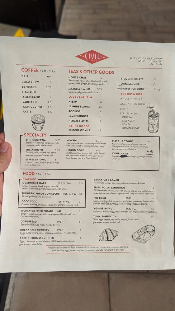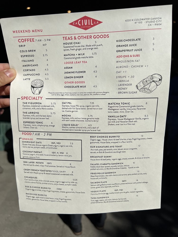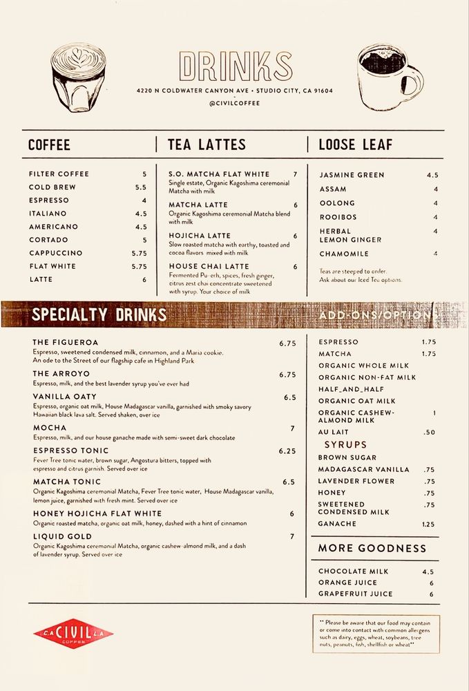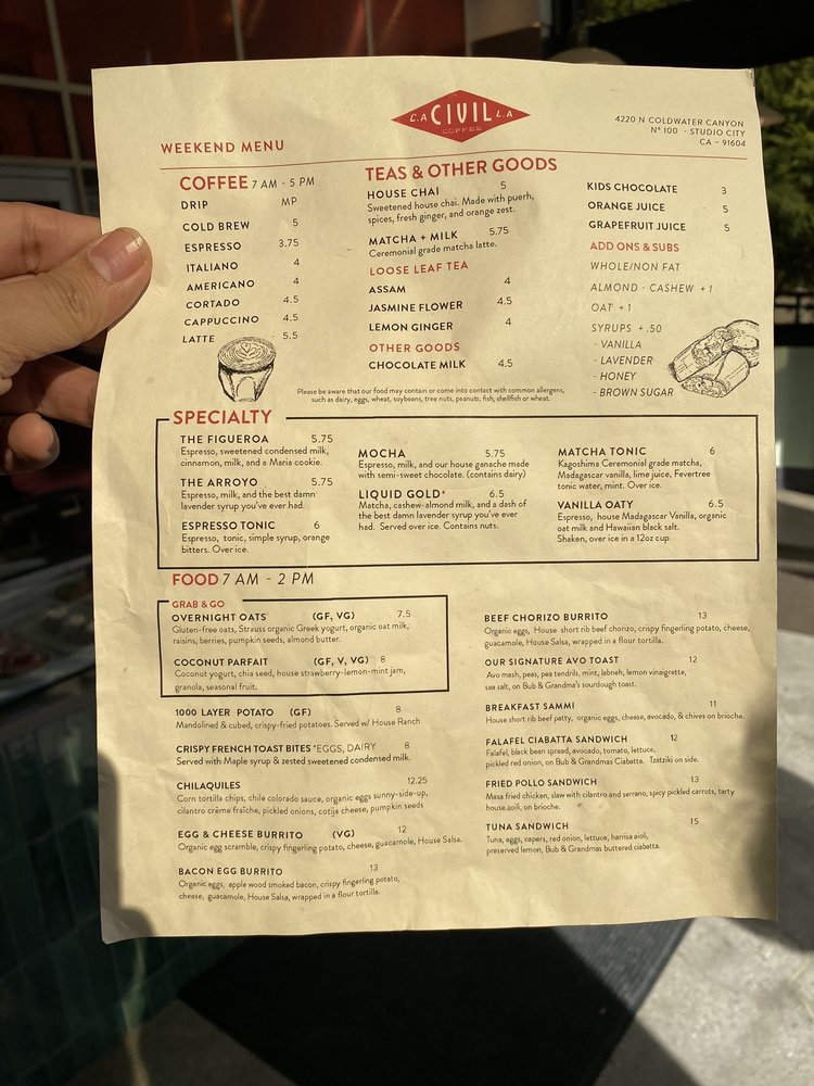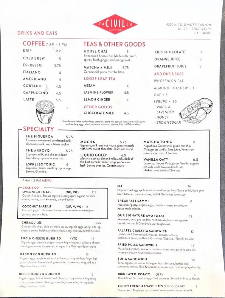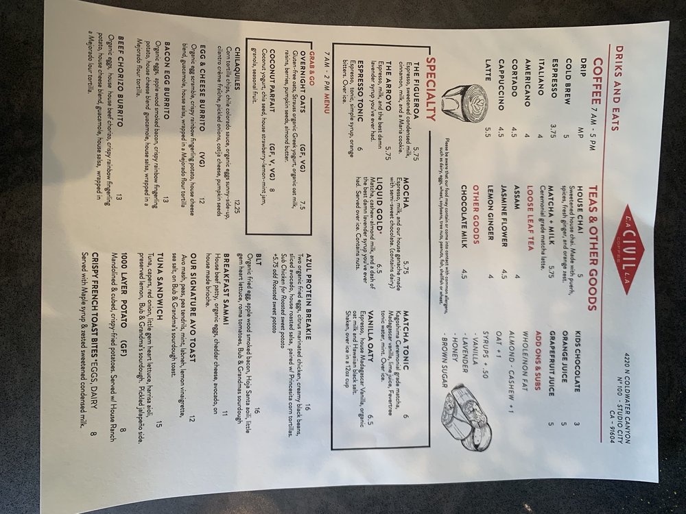Civil Coffee Studio City Menu (Update 2025)